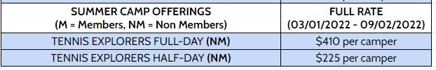 Ages 13+: Tennis session is from 9:15am-10:15am