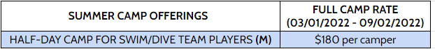 SUMMER HALF DAY CAMP FOR SWIM/DIVE TEAM PLAYERS (Ages 4-14)